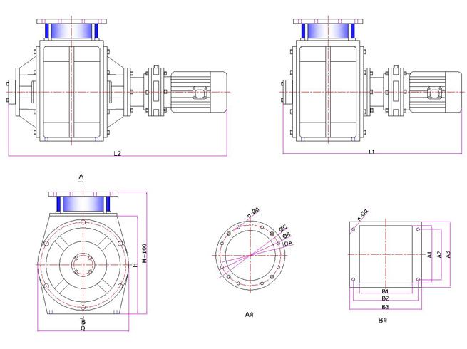 入口/出口:入口为圆口并配有透明视窗,以便观察物料的流动状况;出口为方形增大了出口面积使物料顺利排出。
